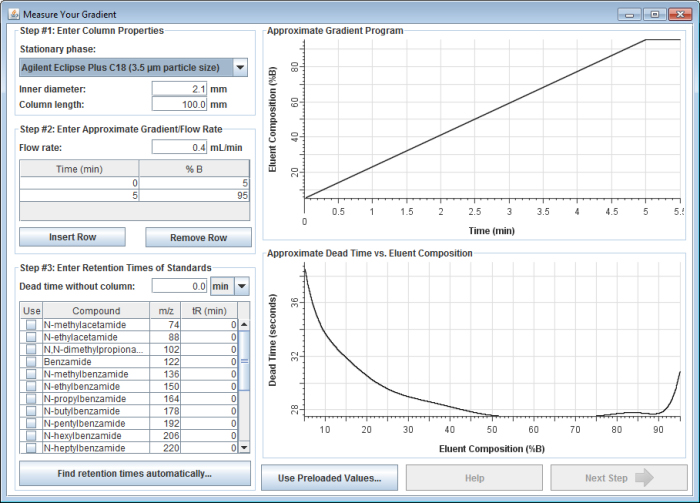 4) Enter the retention times you measured for each of the standards in the Measure Your Gradient test mix. You can manually enter in all the values, or you can click the "Find retention times automatically..." button to automatically extract the retention times from an mzXML, mzML, or netCDF file of the LC-MS run (see previous step).
