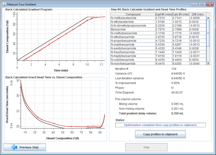 6) Click on the "Back-Calculate Profiles" button to begin back-calculating the gradient. First, the gradient delay is back-calculated. The gradient delay volume is the sum of all the volume in the tubing, connectors, and pump that is between the point where the solvent is proportioned and the column inlet. The gradient delay volume causes a delay between the time the HPLC pump is programmed to produce a certain solvent composition and when it actually reaches the column.